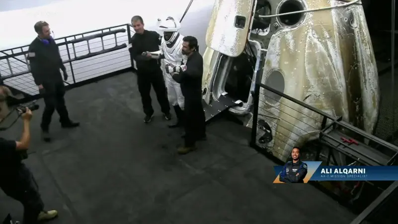 وبدأت “دراغون” التي تقل السعوديين وزميليهما الأميركيَّين بيجي ويتسون وجون شوفنر، رحلة العودة التي استغرقت نحو 12 ساعة قبل الوصول إلى المياه، أمس، معلنة انتهاء المهمة الفضائية “Ax-2” التي أطلقتها المملكة في 22 مايو/أيار الجاري كأول مهمة علمية سعودية نحو الفضاء.