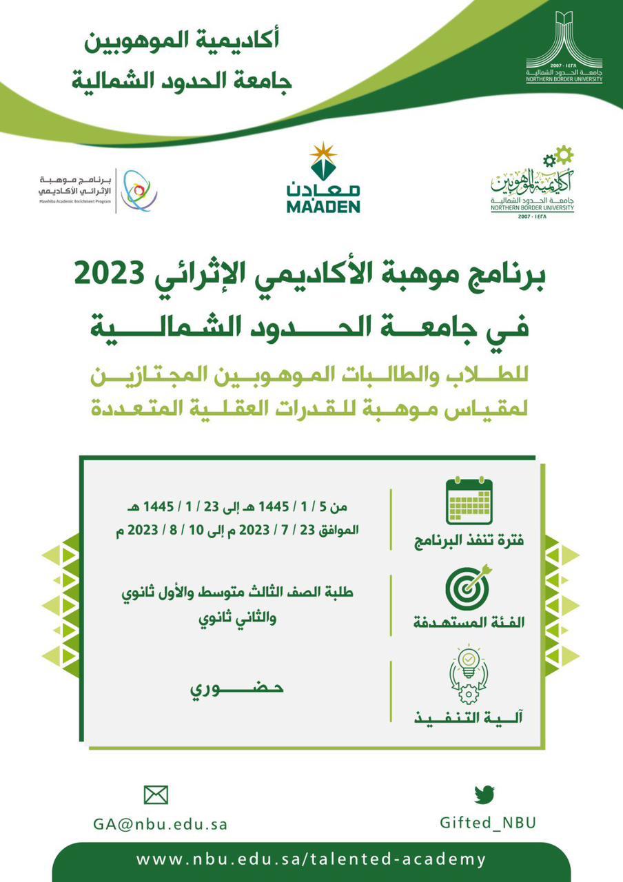 أطلقت جامعة الحدود الشمالية التسجيل في برنامج موهبة الإثرائي الأكاديمي للموهوبين\ن برعاية سعادة رئيس جامعة الحدود الشمالية المكلف أ.د. فراس بن محمد المدني، والذي تنظمه الجامعة بالشراكة مع مؤسسة الملك عبدالعزيز ورجاله للموهبة والإبداع “موهبة” ورعاية مقدمة من الشركة العربية السعودية للتعدين “معادن” خلال الفترة من ٥-٢٣ / ١ / ١٤٤٥ هـ في رحاب الجامعة