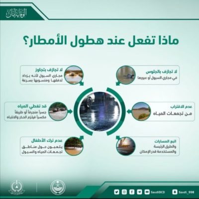 بثت أمانة العاصمة المقدسة بعض الإرشادات التوعوية تزامناً مع التنبيهات الواردة من المركز الوطني للارصاد ، إذ نصحت بضرورة متابعة حالة الطقس وتحذيرات الجهات الرسمية عن الحالة المطرية المتوقعة بشكل مستمر، والالتزام بالتعليمات الواردة، والابتعاد عن مواقع تجمعات المياه ومصادر الكهرباء في الأماكن العامة .