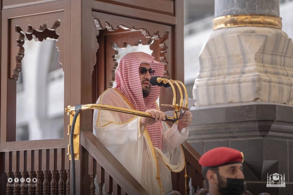 واستهل خطبته قائلاً: من أعظم ما يسمو إليه العبد، ويَسعى سَعيَه لنَيله حبُّ الله تعالى له؛ لأنه حُبُّ الخالقِ الملكِ العظيمِ لعبده، ومَن بيده نفُعُه وضَرُّه، وإحياؤُه وإماتتُه، وإغناؤُه وإقناؤُه، وإنَّ لبلوغ تلك المرتبةِ الكبرى طُرُقًا وأسبابا، فأولُها وأولاها: الإيمانُ به سبحانه؛ فكلما كان العبدُ أقوى إيمانًا ازداد حُبُّ اللهِ تعالى له وتحقيقُ الإيمانِ يكون بالقلب واللسان والجوارح، فتحقيقُهُ بالقلبِ يكون بتصديقِه بالله تعالى، وما يجبُ له وإقرارِه وإذعانِه، وتحقيقُه باللسانِ يكون بالنطقِ بكلمةِ التوحيد، وتحقيقُه بالجوارحِ يكون بالعمل الصالح.