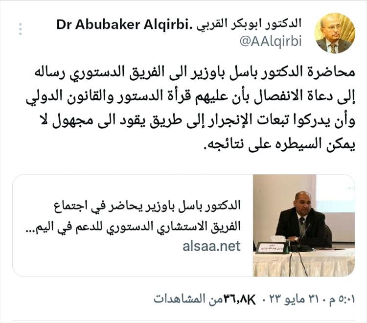 علق نشطاء على استعانة الوزير الأسبق أبوبكر القربي في تغريدته بفقيه دستوري يمني خريج جامعة آل البيت في الأردن ، لتبيان الوضع القانوني لاستقلال الجنوب وفق الدستور اليمني والقانون الدولي.