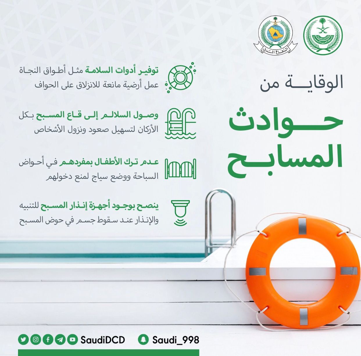 وأهاب الدفاع المدني بضرورة توفير أدوات السلامة، مثل أطواق النجاة والأرضيات المانعة للانزلاق على الحواف، وعدم ترك الأطفال في أحواض السباحة، ووضع سياج لمنع دخولهم بمفردهم، وتركيب سلالم إلى قاع المسبح في الأركان لتسهيل صعود الأشخاص ونزولهم، وينصح بوجود أجهزة إنذار للتنبيه عند سقوط أي جسم في حوض المسبح .
