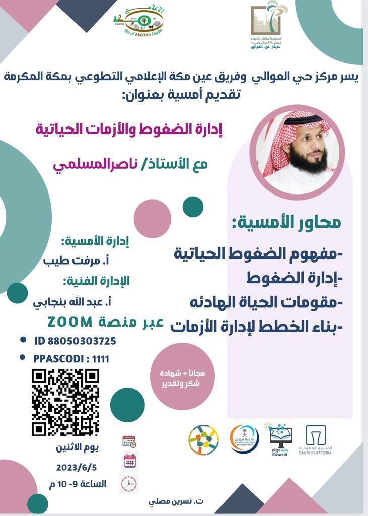 يُقدم مركز حي العوالي وفريق عين مكة الإعلامي التطوعي التابعين لجمعية مراكز الأحياء بمكة المكرمة أمسية عن بعد بعنوان إدارة الضغوط والأزمات الحياتية .