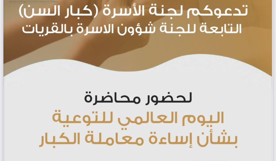 نفذت لجنة شؤون الأسرة بالقريات محاضرة توعوية وذلك بمناسبة اليوم العالمي للتوعية بشأن إساءة معاملة الكبار عبر القاعة الافتراضية ، قدمها المدرب عبدالمجيد معاشي الرويلي ، تناول من خلالها أهم الأنواع الشائعة من إساءة معاملة المسن وعوامل الخطر ومتى يحصل الاشتباه في سوء المعاملة ، وكذلك الوقاية من إساءة معاملة المسنين.