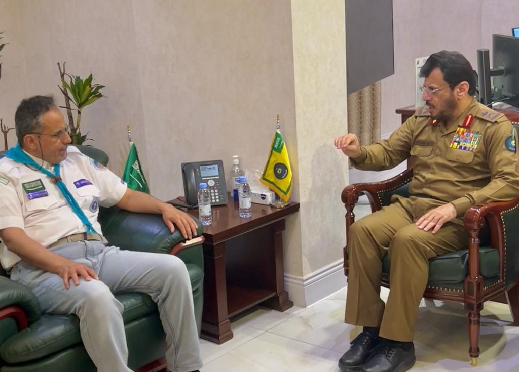 أستقبل اللواء الدكتور حمود بن سليمان الفرج مدير عام الدفاع المدني، في مكتبه أمس بالمشاعر المقدسة نائب رئيس جمعية الكشافة العربية السعودية، المُشرف العام على معسكرات الخدمة العامة في مكة المكرمة والمدينة المنورة والمشاعر المقدسة الدكتور عبدالله بن سليمان الفهد حيث ناقش معه سبل التعاون المشترك فيما يتعلق بتوفير سبل الأمن والسلامة للجميع وتجنب المخاطر بجميع أشكالها وأنواعها في الحج.
