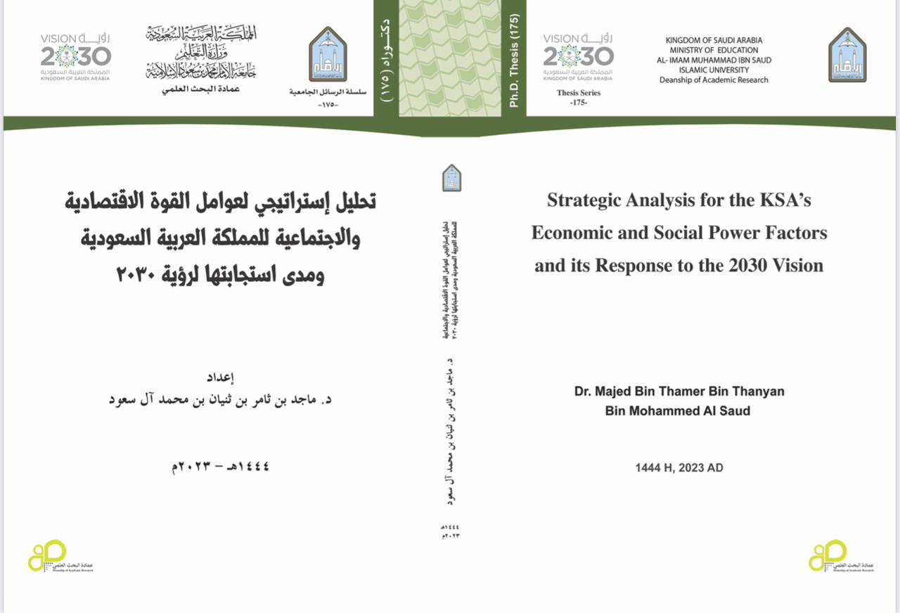 حيث ربط الباحث في كتابه الصادرة عن جامعة الامام محمد بن سعود الإسلامية بعنوان ” تحليل استراتيجي لعوامل القوة الاقتصادية والاجتماعية للمملكة العربية السعودية ومدى استجابتها لرؤية 2030″ عوامل القوة الاقتصادية والاجتماعية للمملكة العربية السعودية برؤية 2030 من خلال تناول الباحث لتحليل استراتيجي لتلك العوامل ومدى استجابتها لرؤية المملكة 2030.