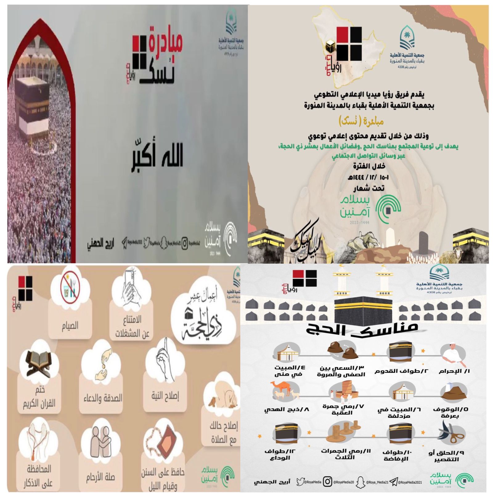 دشن فريق رؤيا ميديا التطوعي الإعلامي بجمعية التنمية الأهلية بقباء بالمدينة مبادرة ” نُسك “ في عامها الثاني خلال شهر ذي الحجة لعام ١٤٤٤هـ عبر منصات الفريق في مواقع التواصل الاجتماعي ،والتي تهدف إلى نشر فضائل وشعائر الحج عبر التواصل الاجتماعي ، والتوعية بالأعمال المستحبة في الحج وذلك عبر تصاميم يتم نشرها في الإعلام الجديد كخدمة تطوعية للحاج والمجتمع ، وتستمر المبادرة حتى نهاية موسم حج هذا العام.