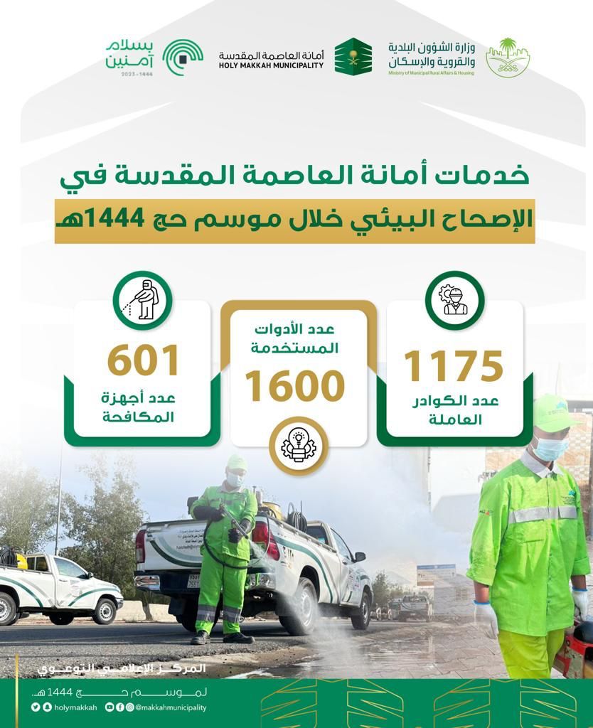 سخرت أمانة العاصمة المقدسة خدماتها في مجال الإصحاح البيئي خلال موسم حج 1444هـ وذلك حرصاً على سلامة ضيوف الرحمن وتأمين الأجواء الصحية الآمنة لهم خلال فتره تواجدهم بالأراضي المقدسة ، حيث جندت الأمانة كوادرها الفنية البالغ عددهم (1175) عامل وفني ، مزودين بأكثر من (1600) من الأدوات المستخدمة و(601) من أجهزة المكافحة .