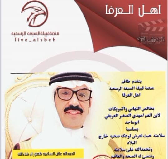 يشارك كلا من الإعلامي الكبير  عبدالله العطيش ، والأستاذة رغد الرفاعي ، منصة أهل العرفا فرحتهم بقيادة الإعلامي سليمان الدغيليب السبيعي ؛ و ذلك بمناسبة خروج الأخ مهدي صغير العريفي من مستشفى الملك فهد بالرياض ، والذي تعرض لوعكة صحية في دولة المغرب وتم نقله لاستكمال إجراءات علاجه بالمملكة العربية السعودية. متمنين له دوام الصحة والعافية . وكل عام والأمة العربية والإسلامية بخير.