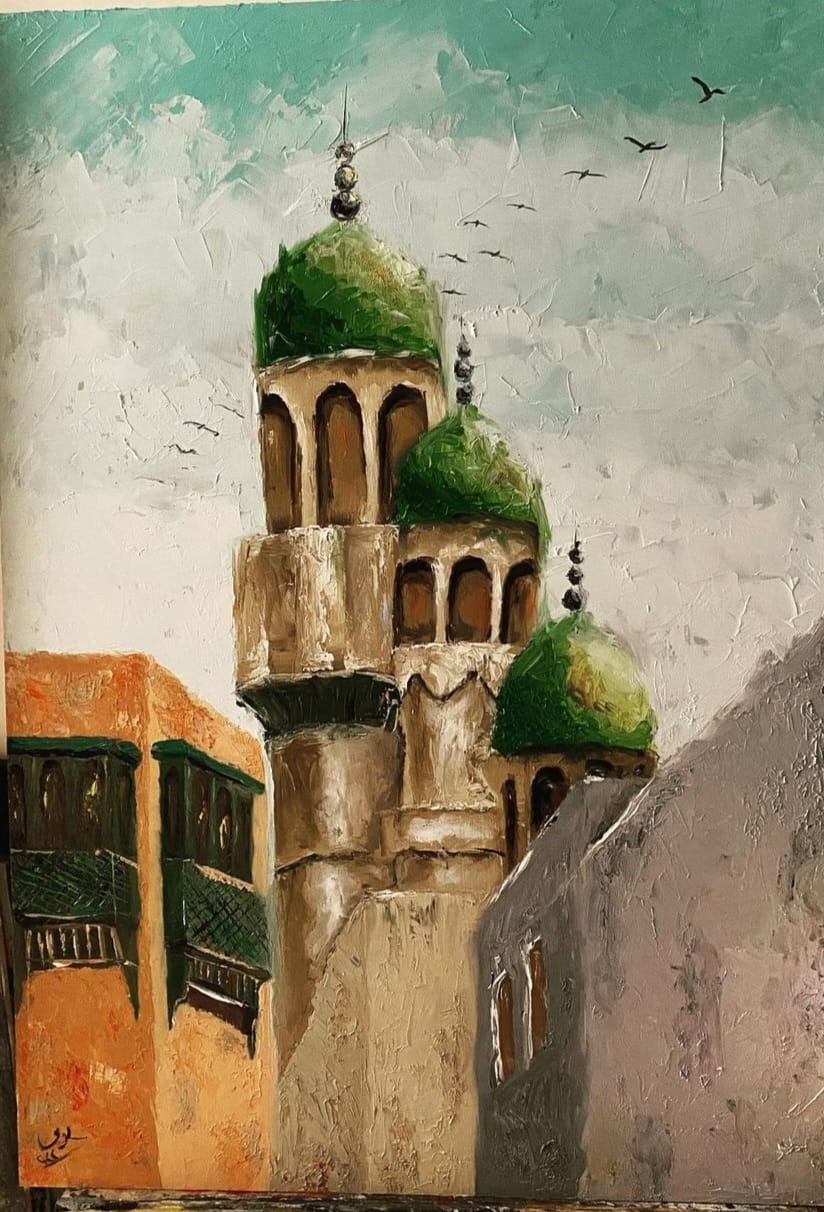 أول لوحه رسمتها كانت لمسجد الرحاب بالألوان الزيتية حتي طبعتها علي دفتر نوت وأوزعه كهدايا من كثر ما حبيت هذه اللوحة