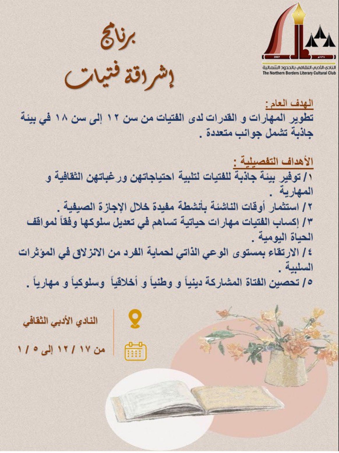 يطلق النادي الأدبي بمنطقة الحدود الشمالية غدًا، أولى برامجه الصيفية لهذا العام بعنوان ”إشراقة فتيات” وذلك خلال الفترة 17-12-1444 ، وحتى 5-1-1445 هـ .