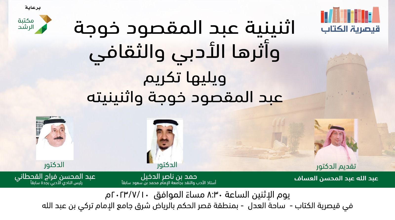 تنظم قيصرية الكتاب بالرياض الاثنين المقبل فعالية بعنوان: “اثنينية عبدالمقصود خوجة.. الأثر الأدبي والثقاقي”، يتحدث فيها كل من الأستاذ في جامعة الإمام محمد بن سعود الإسلامية الدكتور حمد بن ناصر الدخيّل، ورئيس النادي الأدبي الثقافي بجدة سابقاً الدكتور عبدالمحسن بن فراج القحطاني، فيما يدير الحوار أستاذ الإعلام السياسي بجامعة الامام الدكتور عبدالله العساف.