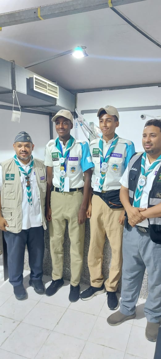 والكشافان الشميمري والخيبري من المعهد الصناعي الثانوي بمحافظة الخرج شاركا تحت إشراف القائد الكشفي التربوي سعد بن محمد الحمود ، وتلقا التدريبات . على المسح والإرشاد من قيادة المسح والإرشاد بمعسكر منى الوادي بمتابعه القائد مصعب بن مهدي الحكمي ومساعده القائد إبراهيم بن محمد مصيري .