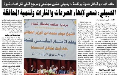 ودعا رئيس الحلف الشيخ فارس الخبيلي، أبناء وقبائل شبوة إلى التكاتف والتلاحم ونبذ الخلافات والوقوف صفا واحدا للدفاع عن حقوقهم والعمل سويا إلى جانب السلطة المحلية بمحافظة شبوة، مؤكدا أن قيادة الحلف ترحب بكافة أبناء شبوة بمختلف توجهاتهم وانتماءاتهم السياسية بعيدا عن التشدد الحزبي والمناطقي والقبلي، لافتًا إلى ان شبوة تعيش مرحلة استثنائية وتواجه تحديات كثيرة وتجاوزها يتطلب تقديم المصلحة العامة وتحقيق الطموحات المرجوة لأبناء شبوة.