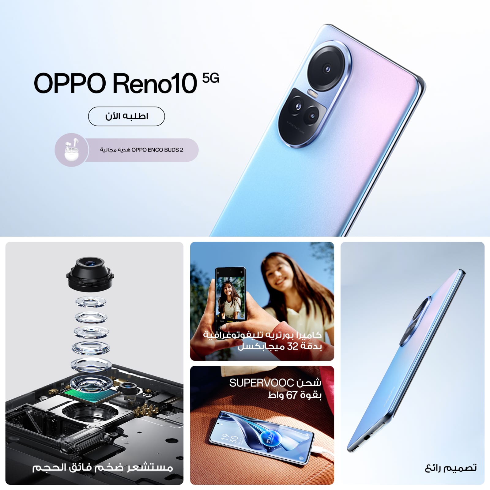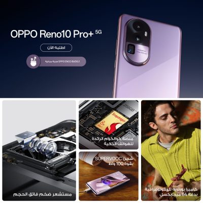 وتقدم سلسلة Reno10 أداء شاملاً لا مثيل له، وميزة احترافية تتمثل في تجربة تصوير بورتريه عالية الجودة، بتصميم نحيف وخفيف الوزن وعصري. جنبًا إلى جنب مع شحن فلاش SUPERVOOCTM يصل إلى 100 وات، و SoC قوي، ونظام تبريد فائق التوصيل، ومحرك الحوسبة الديناميكية، و ColorOS 13.1، وبطارية سريعة الشحن آمنة وطويلة الأمد مدعومة من OPPO’s Battery Health Engine و شريحة إدارة من SUPERVOOC S power.