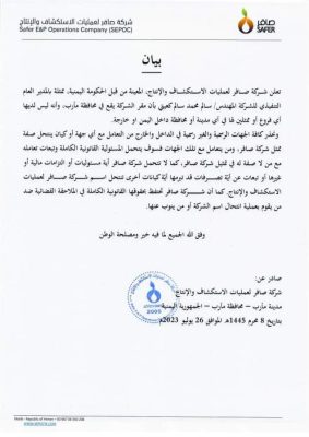وأكدت شركة صافر أن مقرها الرئيسي يقع في محافظة مأرب، وأنها ليس لديها أي فروع أو ممثلين داخل اليمن أو في أي دولة أخرى. وتحذر الشركة من تعامل أي طرف مع تلك الجهات المنتحلة لصفة ممثل الشركة، حيث يتحمل المتعامل كامل المسؤولية القانونية لتبعات تلك العمليات.