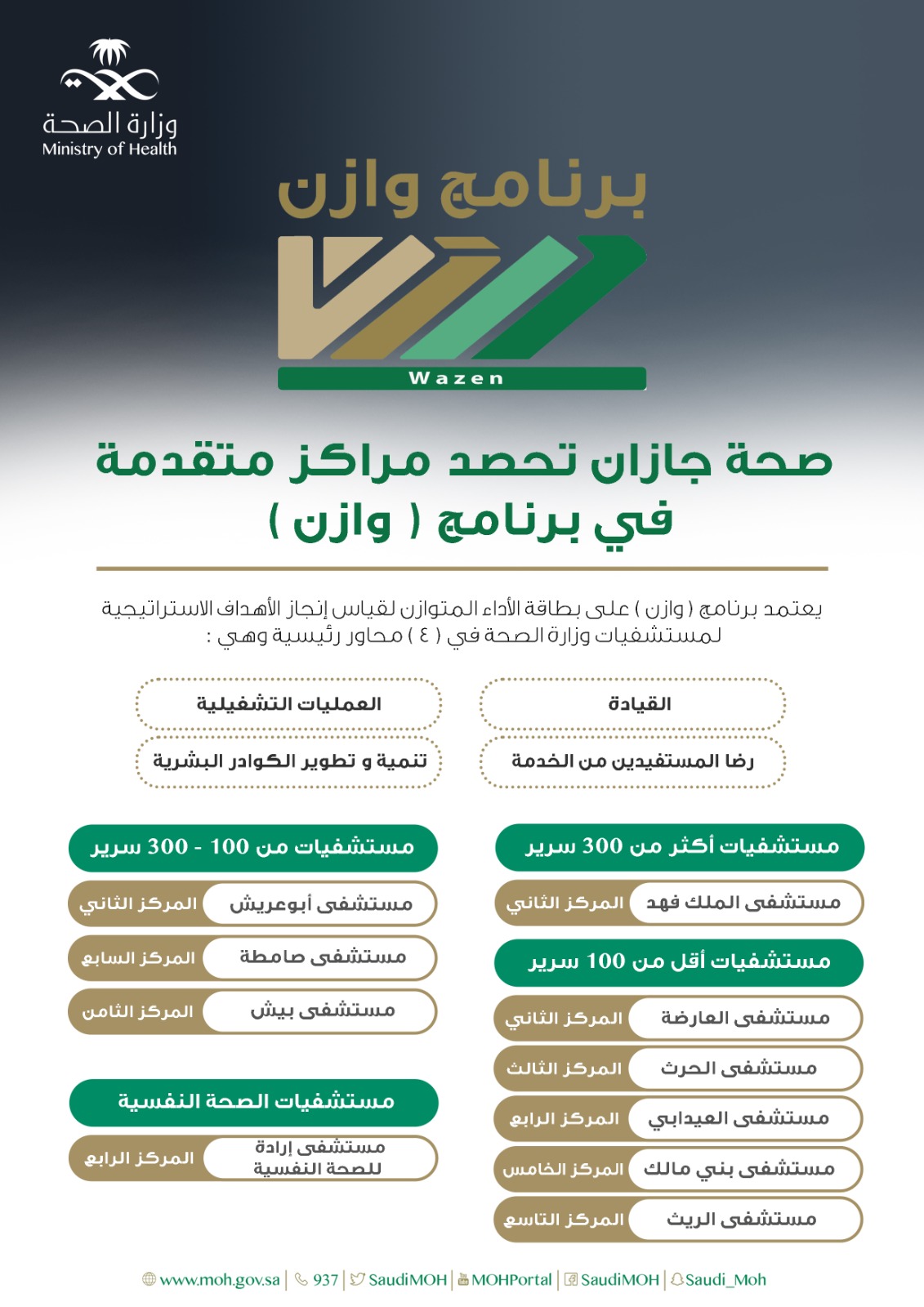 حصدت 10 مستشفيات من صحة جازان مراكز متقدمة في برنامج ” وزان ” وذلك على مستشفى مستشفيات وزارة الصحة وذلك وفق التقرير الصادر عن الربع الاول من هذا العام ٢٠٢٣ م