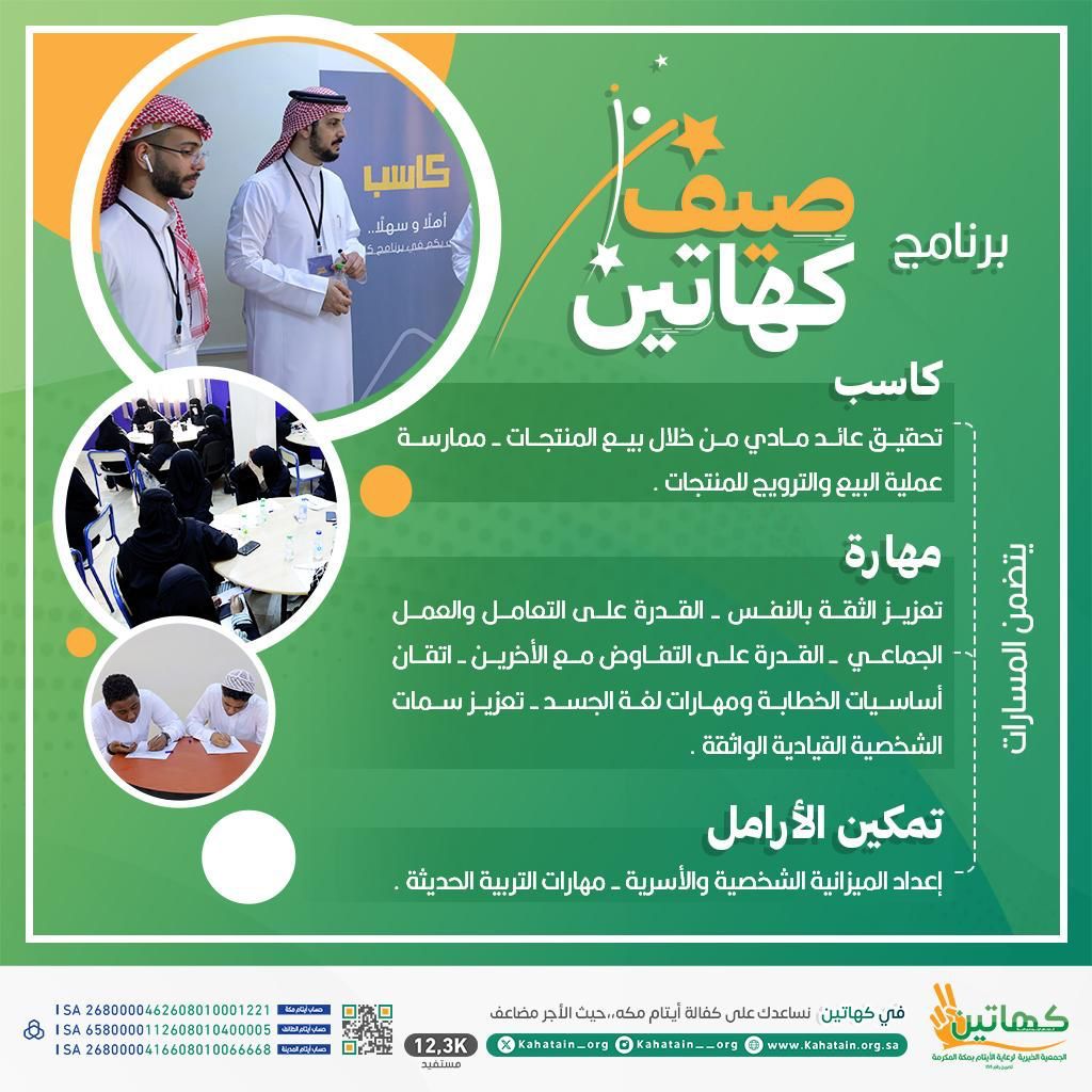 أعلنت الجمعية الخيرية لرعاية الأيتام بمكة المكرمة “كهاتين” عن انطلاق برنامج “صيف كهاتين” والذي يرتكز على 3 مسارات ريادية وتنموية للأيتام وأسرهم وهي (كاسب، مهارة، تمكين الأرامل)، ويستمر برنامج “صيف كهاتين” لمدة 23 يوماً وتختتم بمعرض كاسب الذي سيتمكن فيه المستفيدين من عرض مشاريعهم ومنتجاتهم في سوق الرواد بأحد مراكز مكة المكرمة التجارية.
