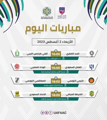تنطلق اليوم ،آخر مباريات دور المجموعات لبطولة كأس الملك سلمان للأندية العربية 2023،وذلك بإقامة 4 مباريات حيث سيلتقي في المجموعة الأولى ناديي الاتحاد السعودي صاحب المركز الاول برصيد 6 نقاط،الذي حجز أولى البطاقات المؤهلة إلى دور الثمانية،بنظيره الشرطة العراقي الذي يملك 4 نقاط من انتصار وتعادل وذلك على ملعب مدينة الملك فهد الرياضية بالطائف.