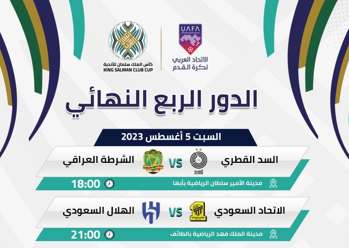 ينطلق الدور الربع النهائي من كأس الملك سلمان بن عبدالعزيز للبطولة العربية يوم غدٍ السبت بالمواجهة الأولى التي تجمع بين فريقي السد القطري والشرطة العراقي ، وذلك عند الساعة ١٨:٠٠ مساءً على مدينة الأمير سلطان بن عبدالعزيز في أيها.