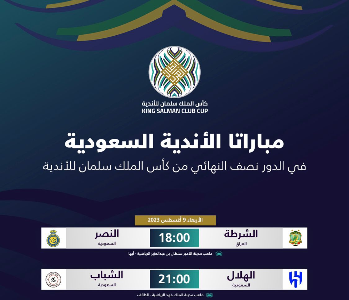 تنطلق مباراتا الدور النصف النهائي من بطولة كأس الملك سلمان بن عبدالعزيز للأندية العربية يوم الإربعاء القادم حيث يلاقي في المباراة الأولى فريق الشرطة العراقي فريق النصر عند الساعة 18:00 مساءً على ملعب مدينة الأمير سلطان بن عبدالعزيز رحمه الله الرياضية في مدينة أبها.