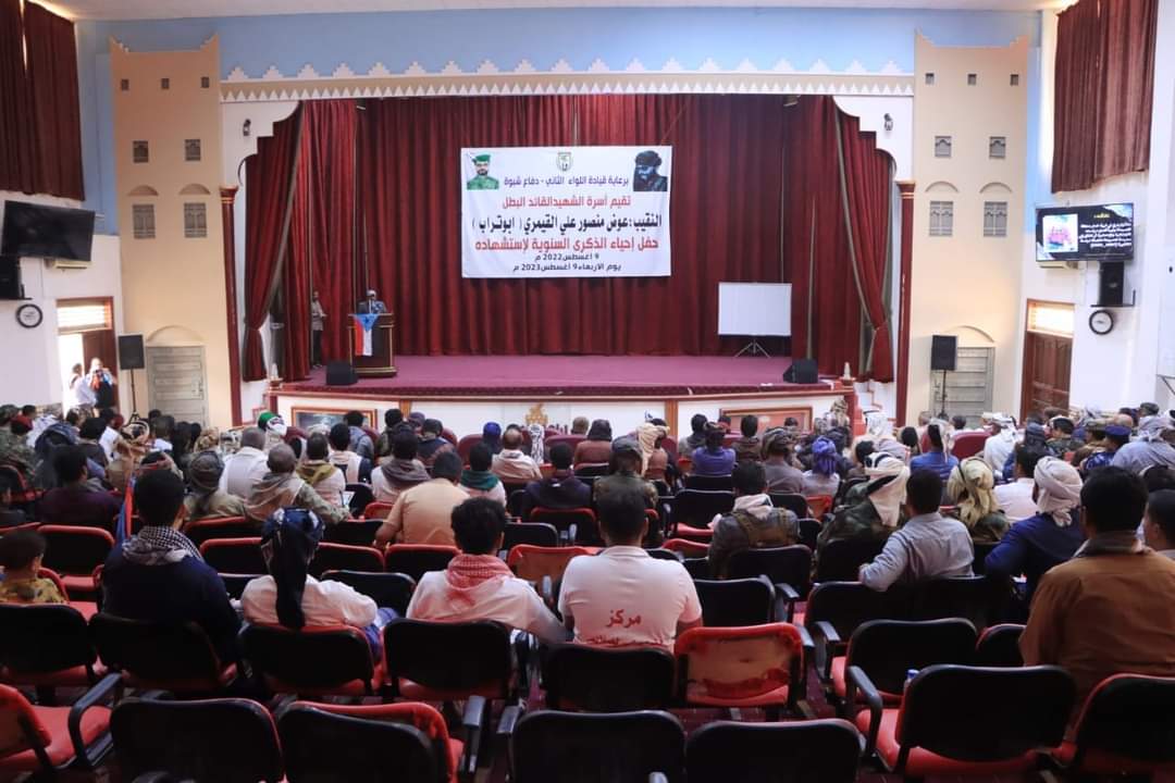 برعاية اللواء الثاني دفاع شبوة أقامت أسرة الشهيد القائد البطل النقيب عوض منصور علي القميري ابو تراب صباح اليوم الأربعاء ، حفل إحياء الذكرى السنوية الأولى لاستشهاده ، في القاعة الكبرى بمركز الشاعر يسلم بن علي الثقافي بعاصمة محافظة شبوة عتق.