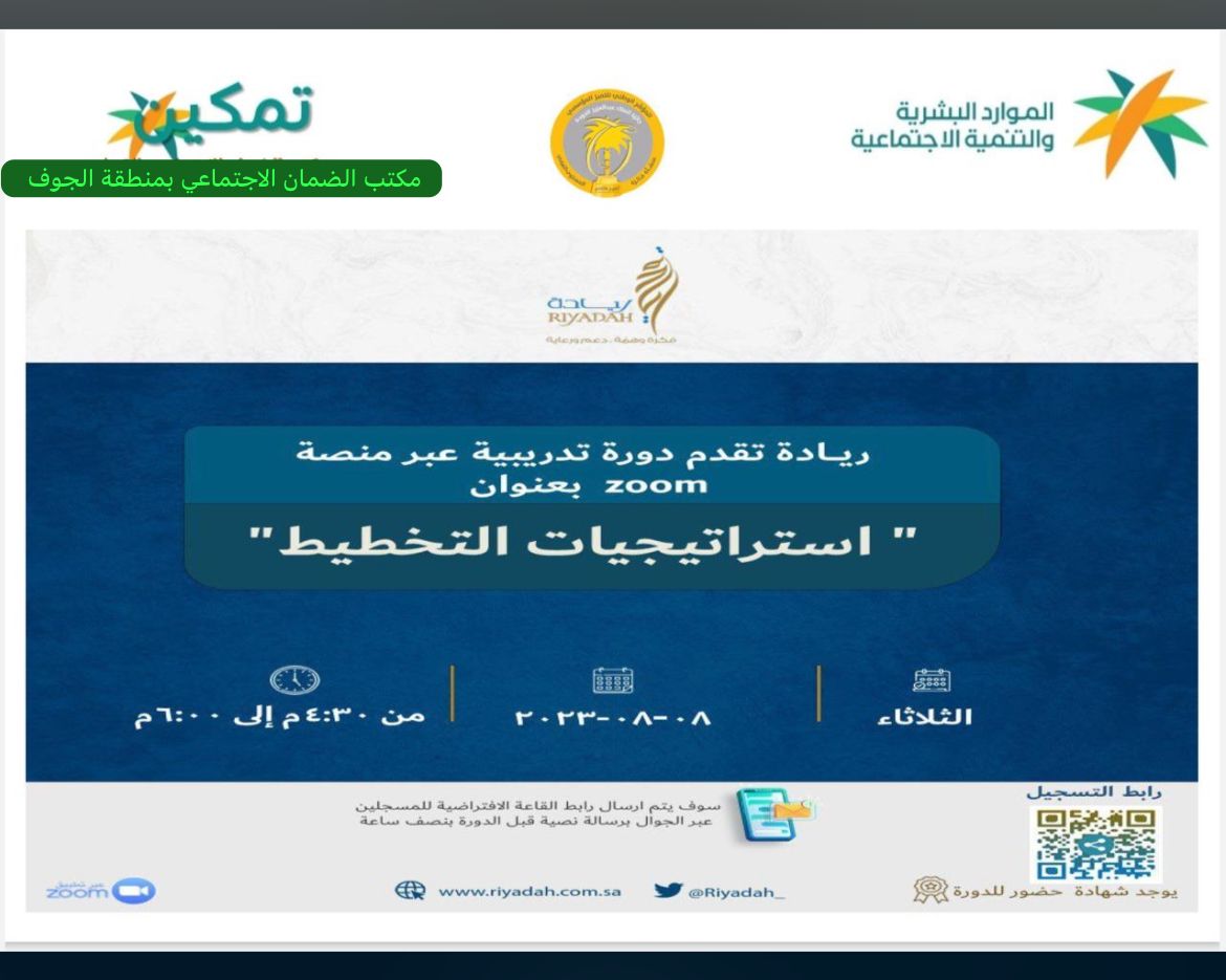نظم المكتب الرئيسي للضمان الاجتماعي بمنطقة الجوف ، ممثلا بقسم التمكين يوم أمس الثلاثاء الموافق ١٤٤٥/١/٢١ هـ دورة تدريبية لمستفيديه ، بالتعاون مع معهد ريادة بالجوف بعنوان (استراتيجيات التخطيط) ، عقدت عن طريق برنامج زوم والتي استفاد منها عدد من مستفيدي الضمان مع منحهم شهادة بالدورة .