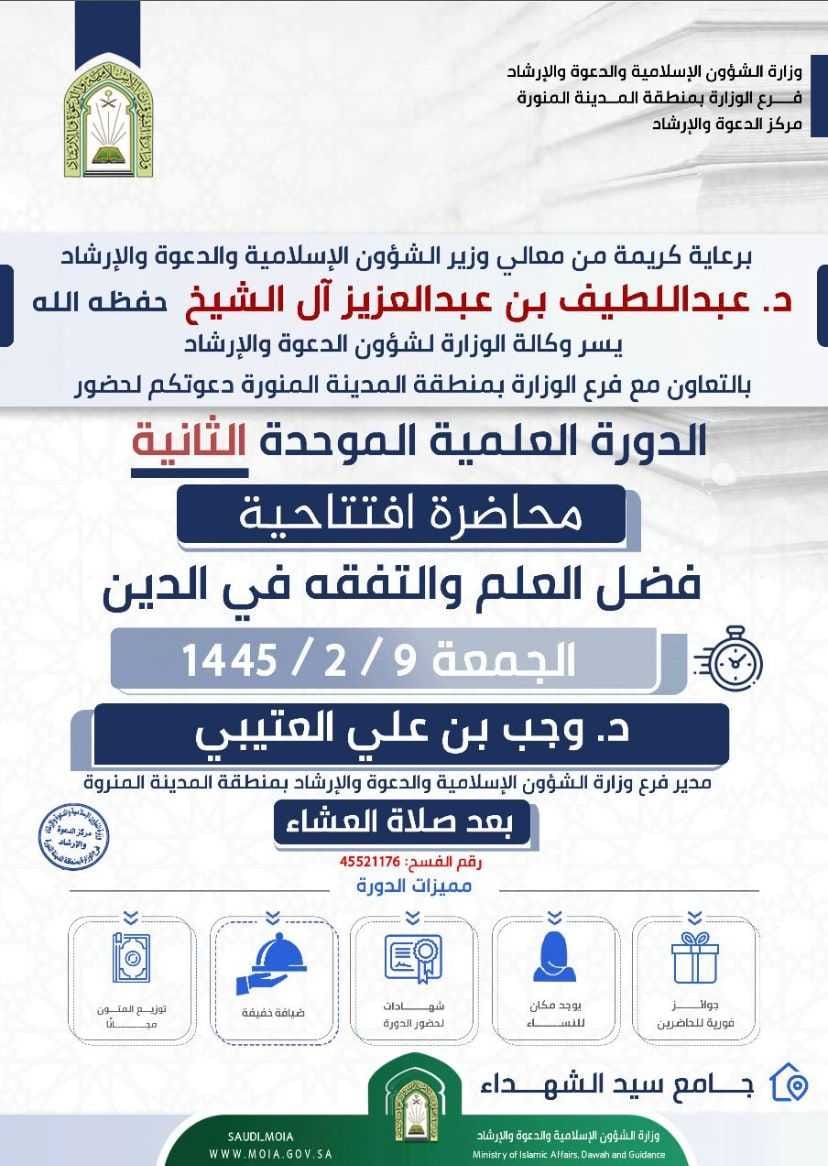 تنظم وزارة الشؤون الإسلامية والدعوة والإرشاد، ممثلة بوكالة الدعوة والإرشاد، الدورة العلمية الموحدة الثانية، والتي تنطلق يوم غدٍ الجمعة وتستمر لمدة ستة أيام، وتتضمن شروحاً في عدد من المتون العلمية.. وذلك في جامع سيد الشهداء بالمدينة المنورة، حيث تقام المحاضرة الافتتاحية للدورة بعنوان: (فضل العلم والتفقه في الدين) يلقيها الدكتور وجب بن علي العتيبي بعد صلاة العشاء.
