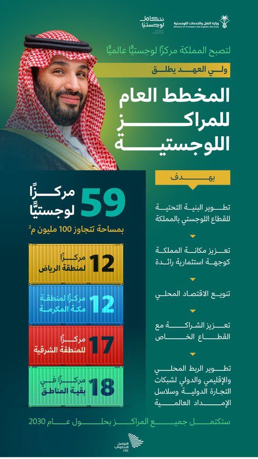 أطلق ولي العهد الأمير محمد بن سلمان المخطط العام للمراكز اللوجستية على امتداد مساحة الوطن ، التي تزخر بالفرص الاستثمارية وخدمات وحلول نقل متكاملة برية وبحرية وجوية وسككية .