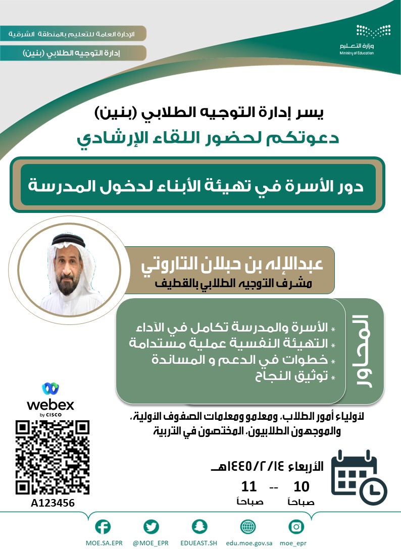 كذلك لقاء أولياء أمور الطلاب ومعلمات الصفوف الأولية و الموجهون الطلابيون، المختصون في التربية بعنوان: دور الأسرة في تهيئة الأبناء لدخول المدرسة، والذي يقف على عدة محاور منها: