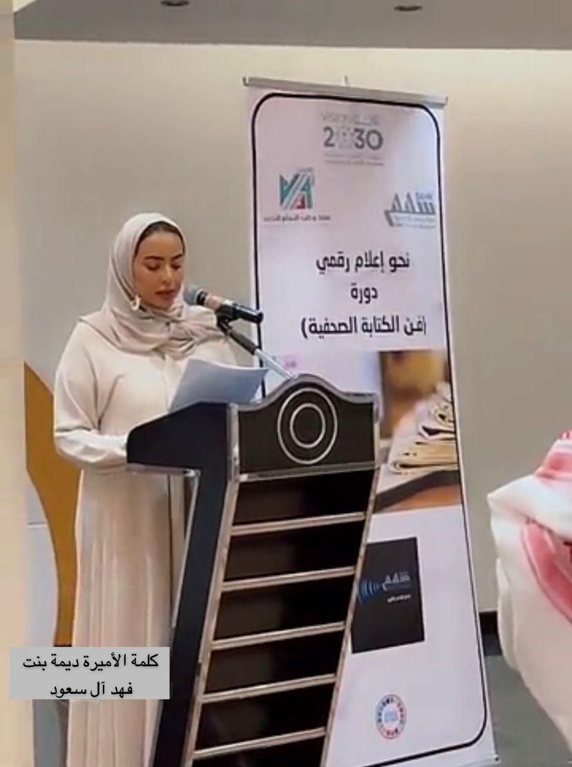 تحت رعاية وتشريف صاحبة السمو الملكي الأميرة ديمة بنت فهد بن مشاري آل سعود ـ والأستاذ فيصل المطلق ، وبحضور الأستاذ أحمد عزير مدير عام صحيفة سهم الإلكترونية، اختتمت الدورة الأولى ( فن كتابة المادة الصحفية) التى تم عقدها من قبل معهد وطن التعليم للتدريب ، بالتعاون مع صحيفة سهم الإلكترونية ، والتي استمرت لمدة ثلاثة أيام بواقع 12 ساعة تدريبية ، والمنعقدة في فندق مدريم كراون في مدينة الرياض خلال الفترة 2023/1/31/30 spt .