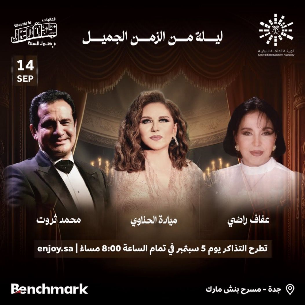 أما جمهور جدة في يوم 14 سبتمبر على موعد مع أمسية طربية من زمن الجميل، يشارك الفنانة مياده الحناوي في الحفل الفنانة القديرة عفاف راضي والتي تعتبر من فنانات مصر ن لمعت في نهايه السيتينيات وبدايه السبعينيات غنت الأغنيات العاطفية، وأغنيات الأطفال، أيضا يشارك الفنان والمطرب محمد ثروت والذي بدأ مسيرته أيضا في أغاني الأطفال والأغنيات الوطنية والدينية والعاطفية، ولحّن له كبار الملحّنين وعلى رأسهم موسيقار الأجيال ومحمد الموجي وحلمي بكر و عمار الشريعي.