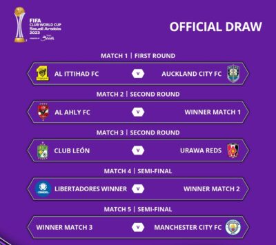 ويواجه ممثل الوطن ” عميد الأندية السعودية” نادي الاتحاد أوكلاند سيتي النيوزيلندي ضمن الدور الأول من بطولة كأس العالم يوم 12 ديسمبر 2023م والفائز من الفريقين سيواجه فريق الأهلي المصري ، ويواجه فريق أوراوا ريدز الياباني فريق ليون المكسيكي ، والفائز منهما يلاقي فريق ليبارتدوس.