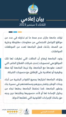 أكدت جامعة جازان عدم صحة ما تم تداوله في بعض مواقع التواصل الاجتماعي من ادعاءات عن فصل الجامعة لعدد من الموظفات السعوديات، مشددة على أنها معلومات مغلوطة وعارية من الصحة.