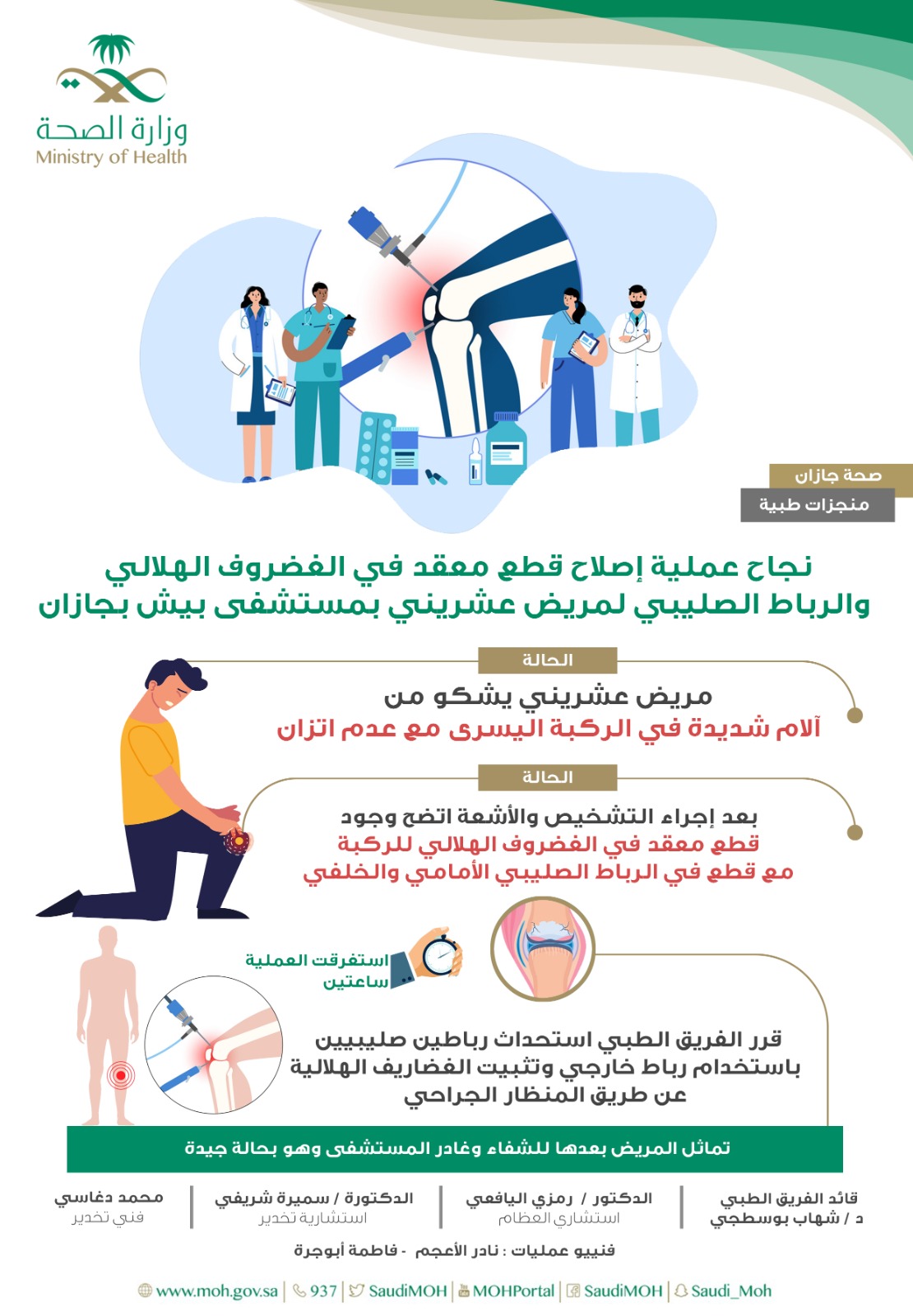 قالت صحة جازان بأن فريق جراحة الأربطة والغضاريف بمستشفى بيش العام بجازان تمكن من إصلاح الرباط الصليبي وتثبيت الغضاريف الهلالية لمريض عشريني .