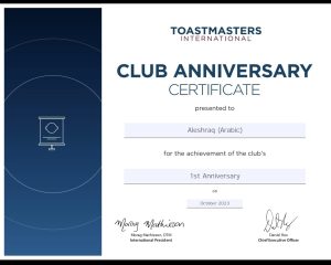 حصل نادي الإشراق على شهادة بمناسبة إكماله عامه الأول في مسيرته ، من التوستماسترز العالمية .