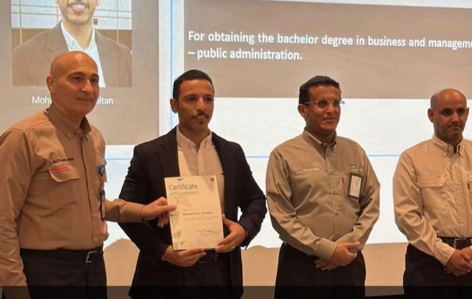 كما تم تكريم الأستاذ: محمد سعد السلطان، من قبل قسم منع الخسائر في ارامكو لحصولة على درجة البكالوريوس