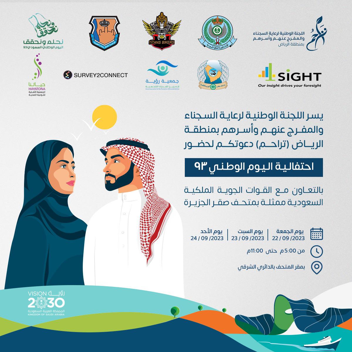 تعتزم اللجنة الوطنيه لرعاية السجناء والمفرج عنهم وأسرهم بمنطقة الرياض،إقامة احتفال بالذكرى الثالثة والتسعين لليوم الوطني للمملكة العربية السعودية مع القوات الجوية الملكية السعودية ، ممثلة بمتحف صقر الجزيرة لمدة ثلاثة أيام اعتبارا من تاريخ ٢٢ ديسمبر ٢٠٢٣ م