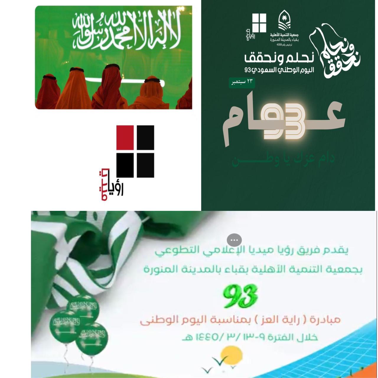 بمناسبة اليوم الوطني ٩٣ ، يطلق فريق رؤيا ميديا بجمعية التنمية الأهلية بقباء بالمدينة المنورة ، (مبادرة راية العز) ، من الأحد 1445/3/9، وتستمر إلى الخميس 3/13 ؛ اعتزازا بهذا الوطن الغالي، وفخرا بمنجزاته، وتدوينا لمشاعره؛ حبًا وانتماءً لكل شبر في هذه الأرض، مرحبين بالنشء والمجتمع الخارجي بكافة فئاته .