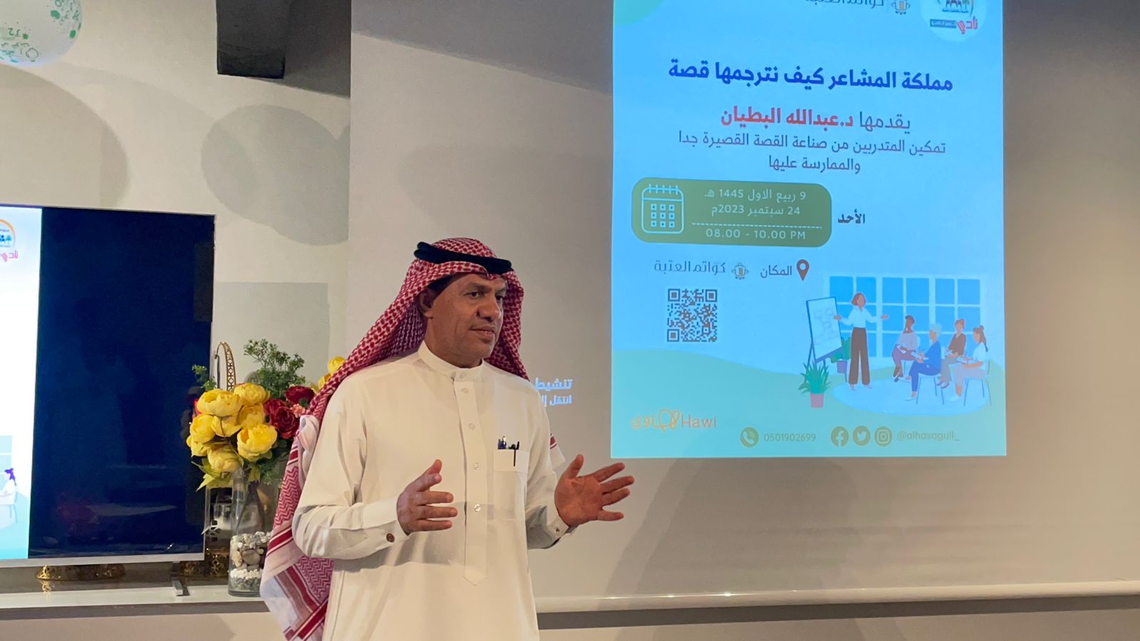 حيث قدم د.عبدالله البطيان ورشة عمل مملكة المشاعر كيف نترجمها قصة بحضور مهتم وفاعل لتقديم نفسه معبرًا مميزًا من خلال ماتم عرضه من برنامج.