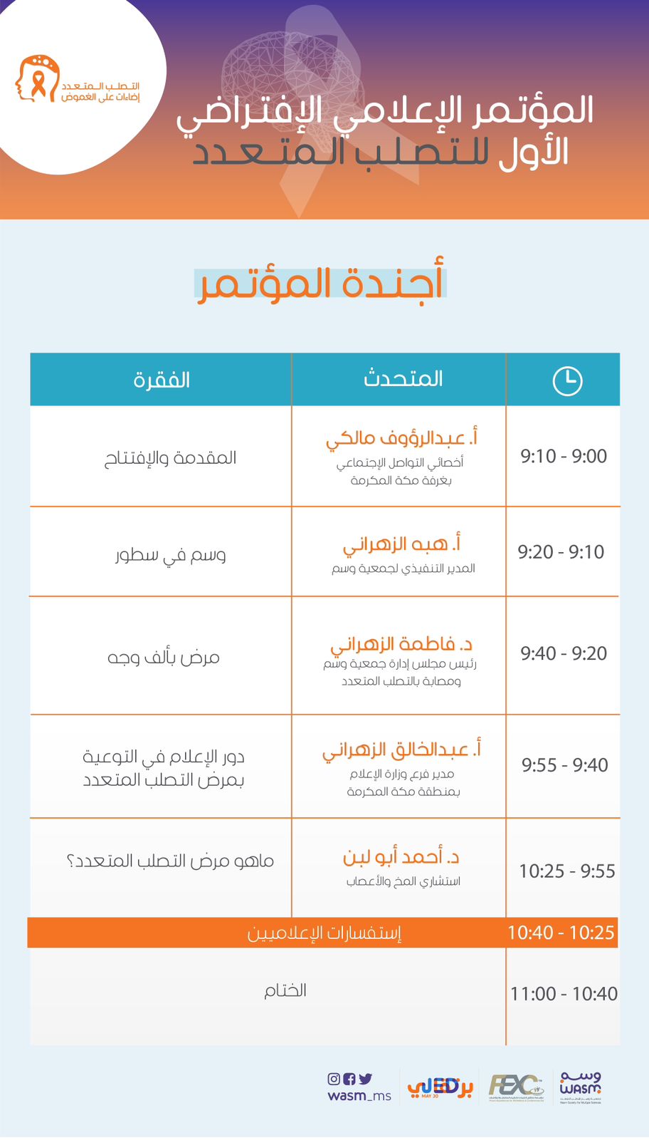برعاية إعلامية من ملتقى الخبرات لتنظيم المعارض والمؤتمرات، تستعد جمعية وسم للتصلب المتعدد لإطلاق المؤتمر الإعلامي الافتراضي الأول “التصلب المتعدد.. إضاءات على الغموض” لتوعية المجتمع الإعلامي بمرض التصلب المتعدد وذلك يوم الأربعاء الموافق 4 أكتوبر 2023 من الساعة 9:00 – 11:00 مساءً عن بعد عبر منصة “زوم”