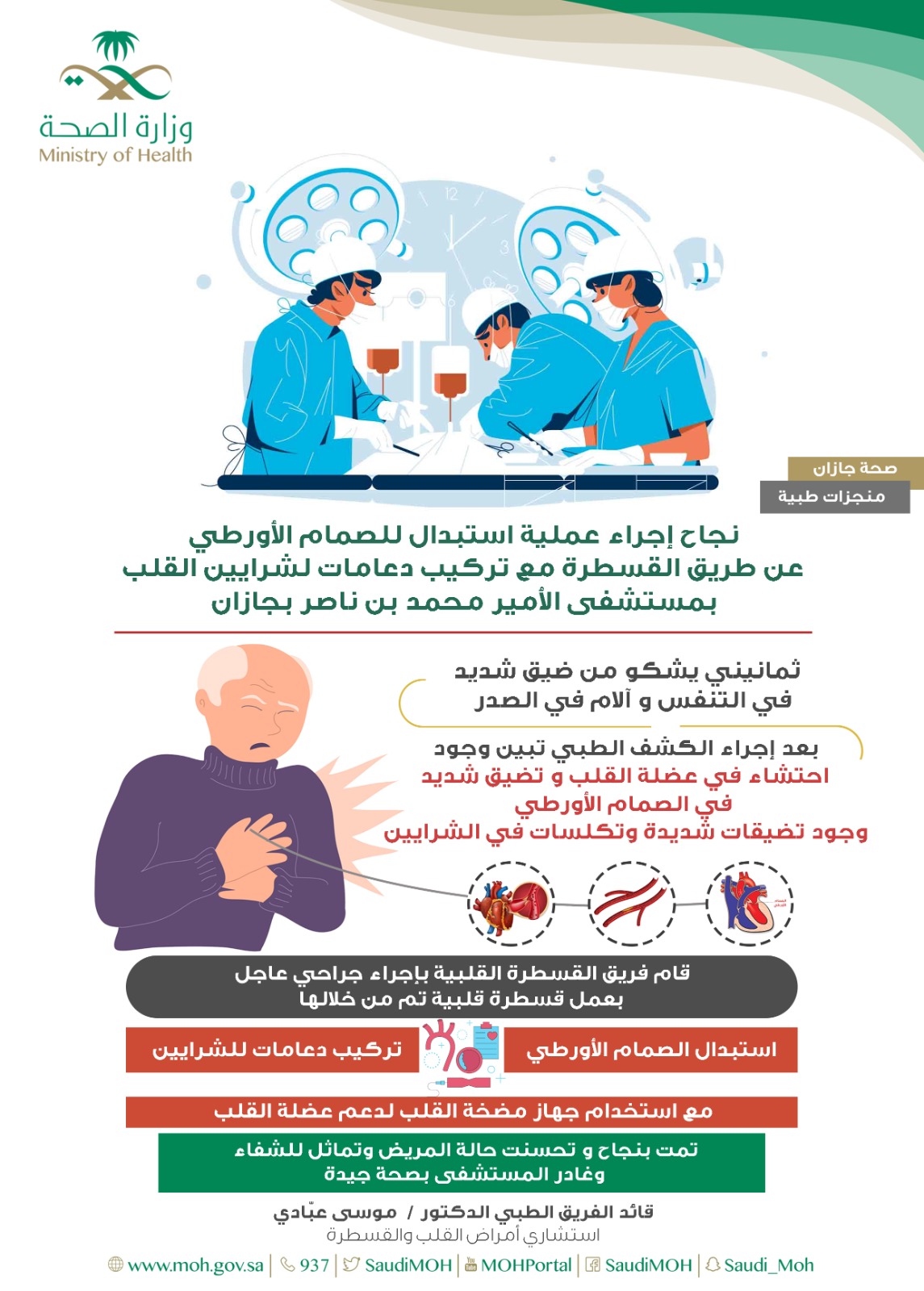أجرى فريق القسطرة القلبية بمستشفى الأمير محمد بن ناصر بجازان عملية استبدال الصمام الأورطي لثمانيني عن طريق القسطرة و تركيب دعامات وجهاز مضخة للقلب.