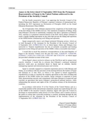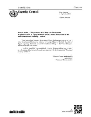 وأكد الخطاب أنه وفقا للمادة 35 من ميثاق الأمم المتحدة وبوصف مصر عضوا مسؤولا في المجتمع الدولي فإن مصر تسترعي انتباه مجلس الأمن مرة أخرى إلى مسألة سد النهضة، وتهيب مصر بالمجلس أن يضطلع بمسؤولياته التي تقع على عاتقه بموجب المادة 24 من الميثاق، وأن يبقي المسألة قيد نظره لضمان التوصل إلى حل سلمي وذلك بسبل منها التنفيذ الكامل لبيان رئيس مجلس الأمن المؤرخ 15 سبتمبر.