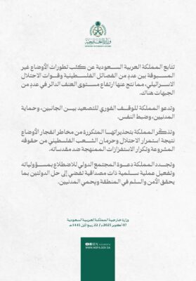 وتذكّر المملكة بتحذيراتها المتكررة من مخاطر انفجار الأوضاع نتيجة استمرار الاحتلال وحرمان الشعب الفلسطيني من حقوقه المشروعة وتكرار الاستفزازات الممنهجة ضد مقدساته.