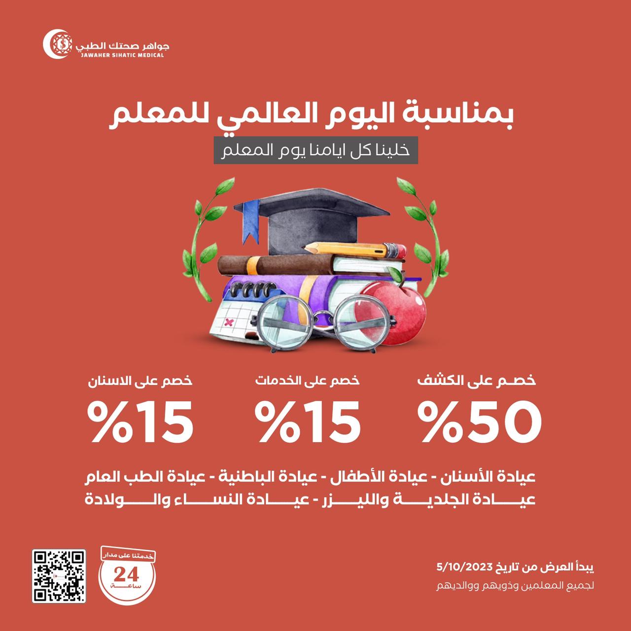 مما لا شك فيه أن المعلم له دور كبير و في غاية الأهمية وله منا كل التقدير والاحترام و لأننا نقدر هذه الجهود ، وبمناسبة اليوم العالمي للمعلم ولأن مجمع جواهر يهتم بصحتك ، قدمنا لكم خصومات خاصة.