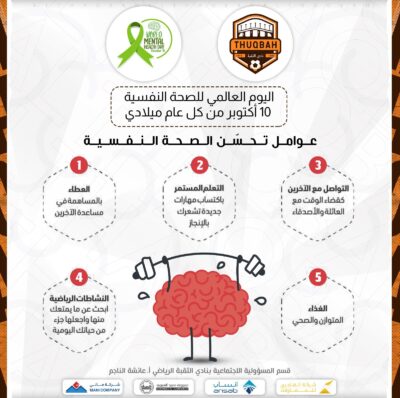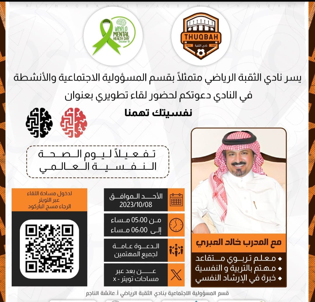 نظم نادي الثقبة الرياضي لقاء اليوم الأحد ٨ أكتوبر ٢٠٢٣ م لتفعيل “اليوم العالمي للصحة النفسية” ، بإدارة إبداعية تحاورية من الاستاذة عائشة الناجم. التي افتتحت اللقاء و رحبت بالضيف و الحضور وانطلقت بالمساحة بكل حماس بحوار احتوى على استفسارات عديدة تهمنا جميعا في الحفاظ على صحتنا النفسية.