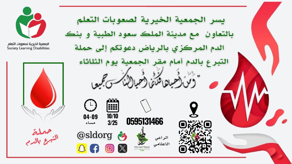 تعتزم الجمعية الخيرية لصعوبات التعلم ، تنفيذ حملة تبرع بالدم ب، التعاون مع مدينة الملك سعود بالشميسي، وبنك المركزي للدم أمام مقر الجمعية بحي المصيف، وذلك يوم الثلاثاء الموافق ١٤٤٥/٣/٢٥ ٢٠٢٣/١٠/١٠ من الساعة الرابعة عصرًا وحتى الساعة التاسعة مساء.
