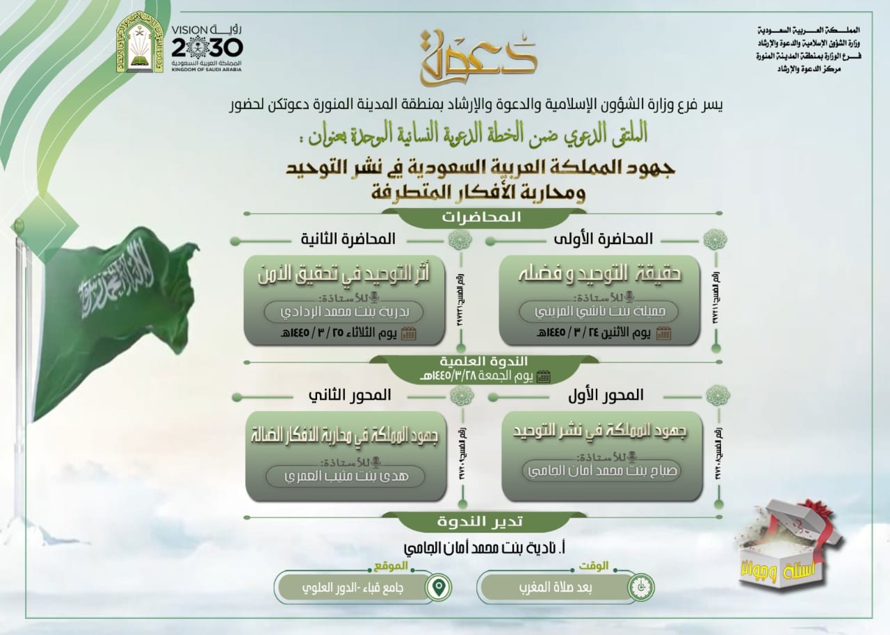 ينظم فرع وزارة الشؤون الإسلامية والدعوة والإرشاد بمنطقة المدينة المنورة، اليوم الاثنين الرابع والعشرين من شهر ربيع الأول الجاري، الملتقى الدعوي ضمن الخطة الدعوية النسائية الموحد بعنوان: “جهود المملكة العربية السعودية في نشر التوحيد ومحاربة الأفكار المتطرفة” وذلك في جامع قباء الدور العلوي بعد صلاة المغرب، بمشاركة عدد من الداعيات.. ويستمر حتى الثامن والعشرين منه.