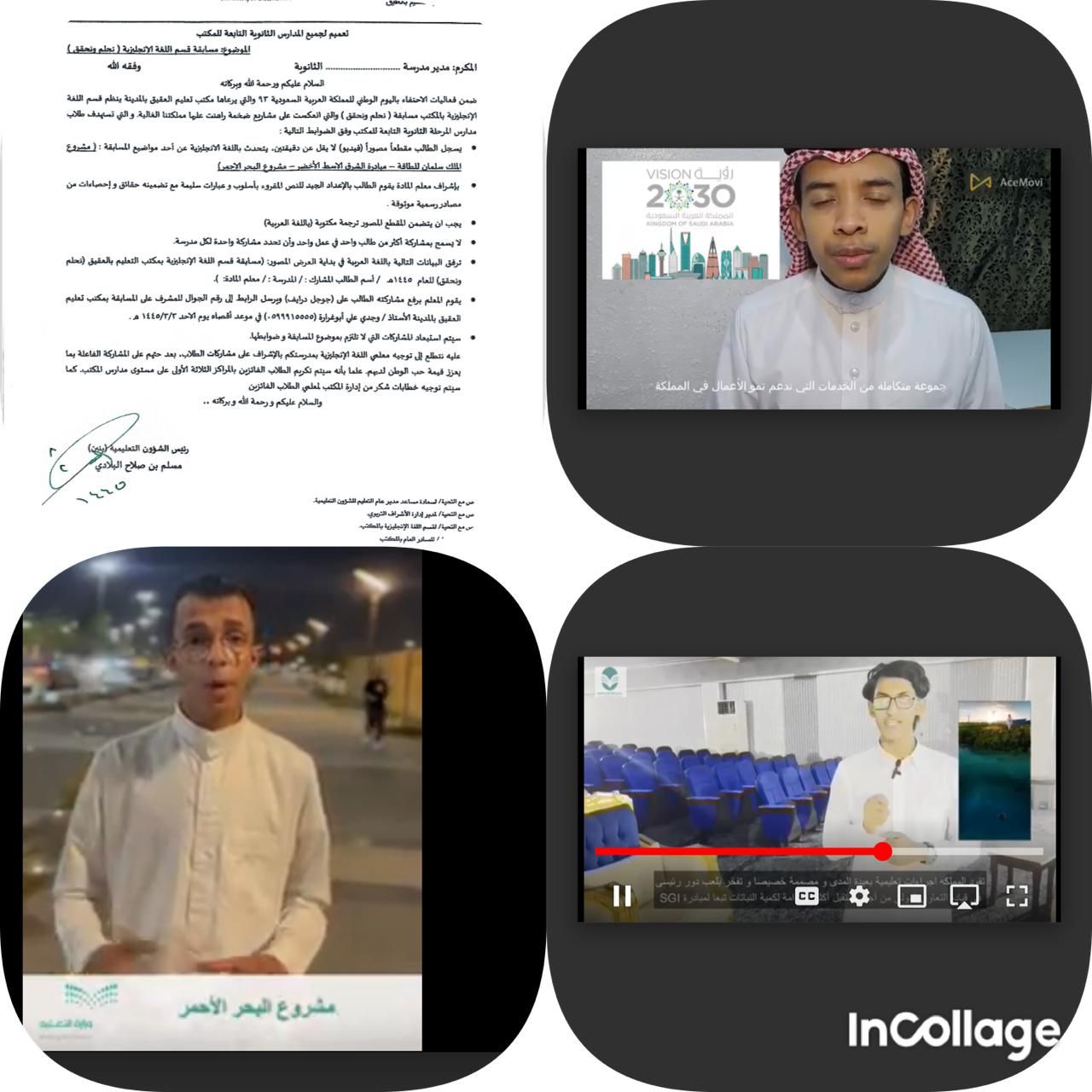 – أن يسجل الطالب مقطعا مصورا ( فيديو) لا يقل عن دقيقتين يتحدث بلغة الإنجليزية عن أحد مواضيع المسابقة : ( مشروع الملك سلمان للطاقة _ مبادرة الشرق الأوسط الأخضر _ مشروع البحر الأحمر ) بإشراف معلم المادة .