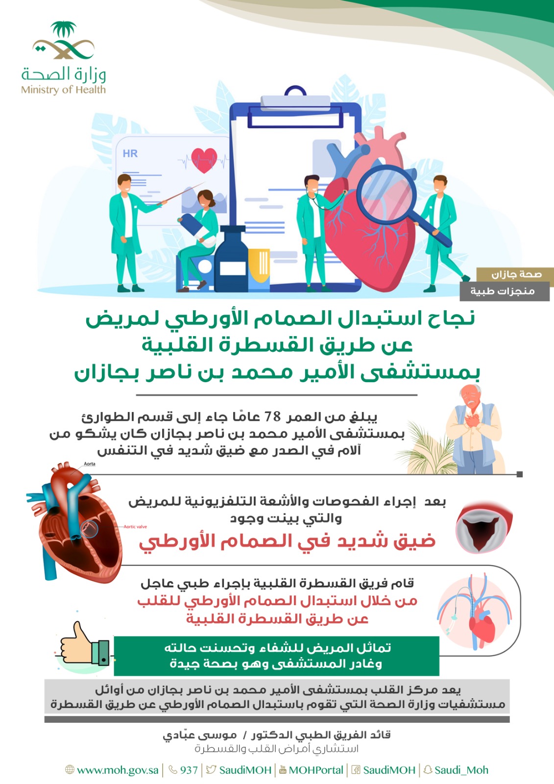 يعد مركز القلب بمستشفى الأمير محمد بن ناصر بجازان من أوائل مستشفيات وزارة الصحة التي تقوم باستبدال الصمام الأورطي عن طريق القسطرة .